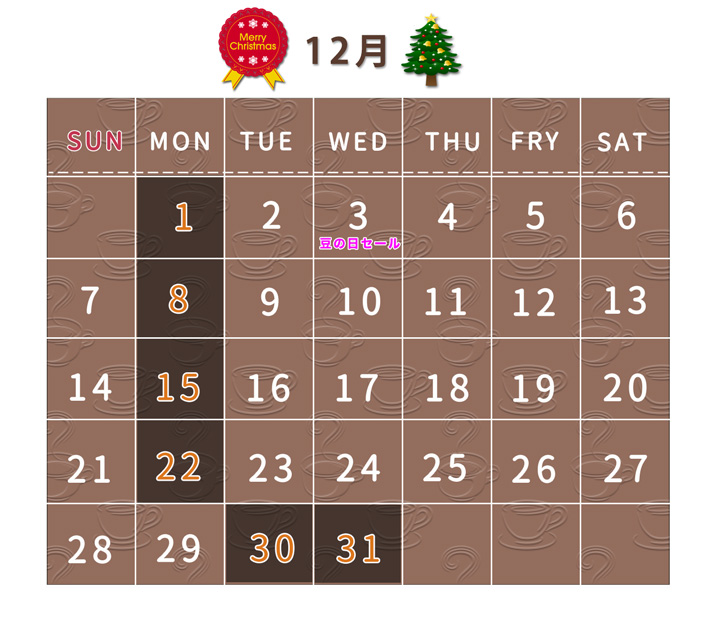 【12月】営業カレンダー☆年末年始休業日のお知らせ お知らせ 2025.12.02 日頃より当店をご利用いただきまして、誠にありがとうございます。 2025年12月の休業日、年末年始休業日をお知らせいたします。 12月 1日(月) 12月 8日(月) 12月 15日(月) 12月 22日(月) 年末年始休業期間 12月 30日(火)〜1月4日(日) なお、12月29日(月)は本年最後の営業となりますが、 営業時間は通常通り10:00〜19:00です。 どうぞよろしくお願いいたします。 大和自家焙煎 桜座珈琲 ☎︎ 0742−35−2088