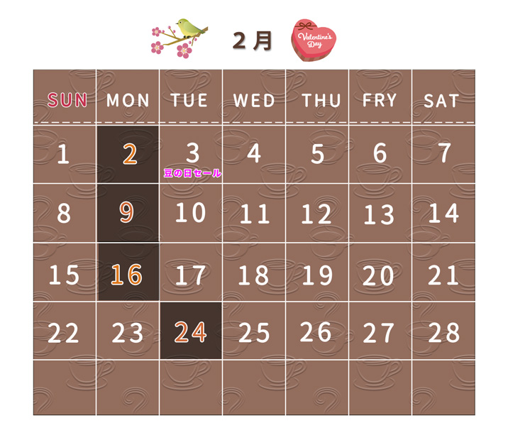 【2月】営業カレンダー☆休業日のお知らせ お知らせ 2026.02.01 日頃より当店をご利用いただきまして、誠にありがとうございます。 2026年2月( 如月)の休業日をお知らせいたします。 2月 2日(月) 2月 9日(月) 2月 16日(月) 2月 24日(火) なお、2月11日(水)建国記念の日、および 23日(月)天皇誕生日は通常通り営業いたします。 どうぞよろしくお願いいたします。 大和自家焙煎 桜座珈琲 ☎︎ 0742−35−2088
