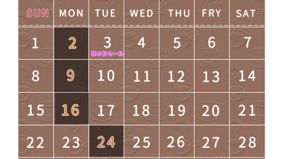 お知らせ 【2月】営業カレンダー☆休業日のお知らせ 2月の休業日は、2月 2日(月)2月 9日(月)2月 16日(月)2月 24日(火)です。祝日の2月11日(水)建国記念の日、および23日(月)天皇誕生日は通常通り営業いたします。2月24日は振替休業となります。 お知らせ