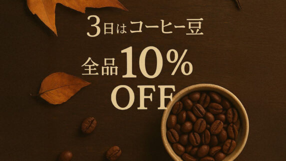 お知らせ 10月3日☆豆の日セールのお知らせ 10月3日は、豆の日セールお買い得デーです。店内のコーヒー豆全品が10%OFF!ぜひこの機会に気になる商品、お気に入り豆のストックまとめ買い、ギフト用など、幅広くご利用くださいね。皆さまのご来店をお待ちしております! お知らせ
